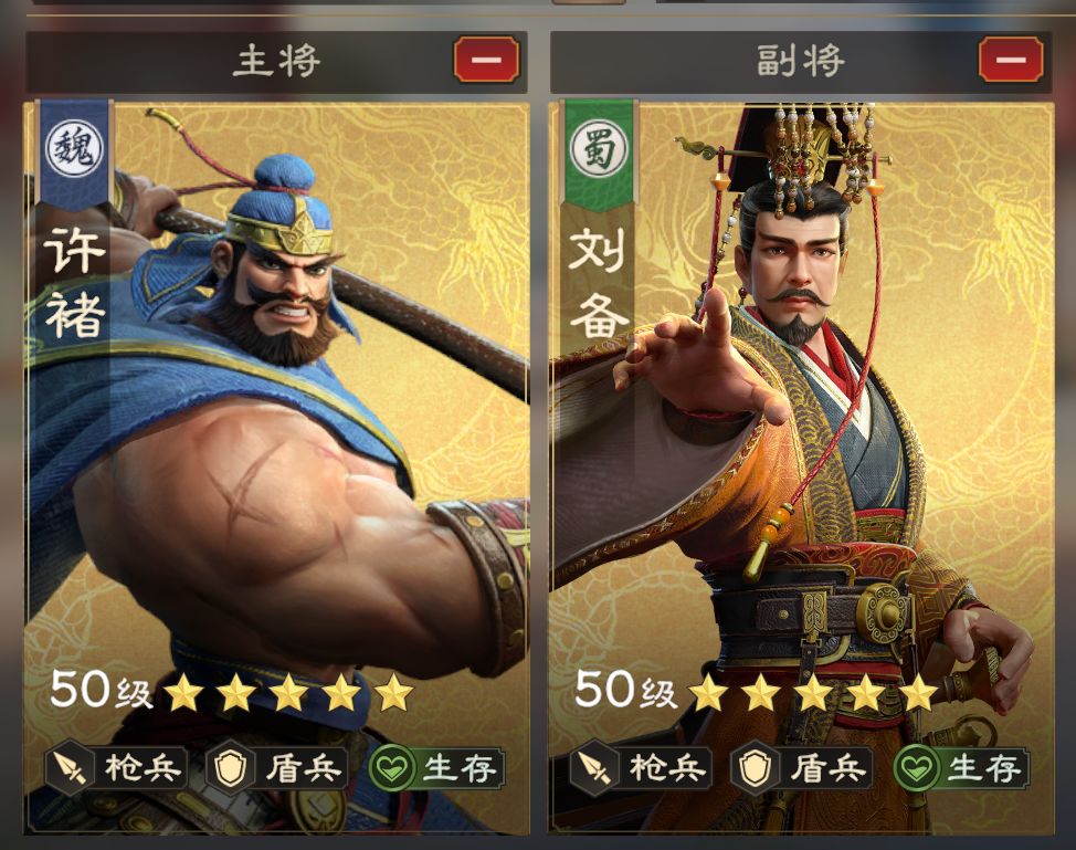 生存盾推荐在赛季中后期构建,主要作为是承伤、推进在线,许褚可以较好的抵挡技能、普攻阵容(如果练度高,对方基本上打不动)。在混战场合,我们战斗在第一线即可,在输出方面,还是需要额外构建主力队。