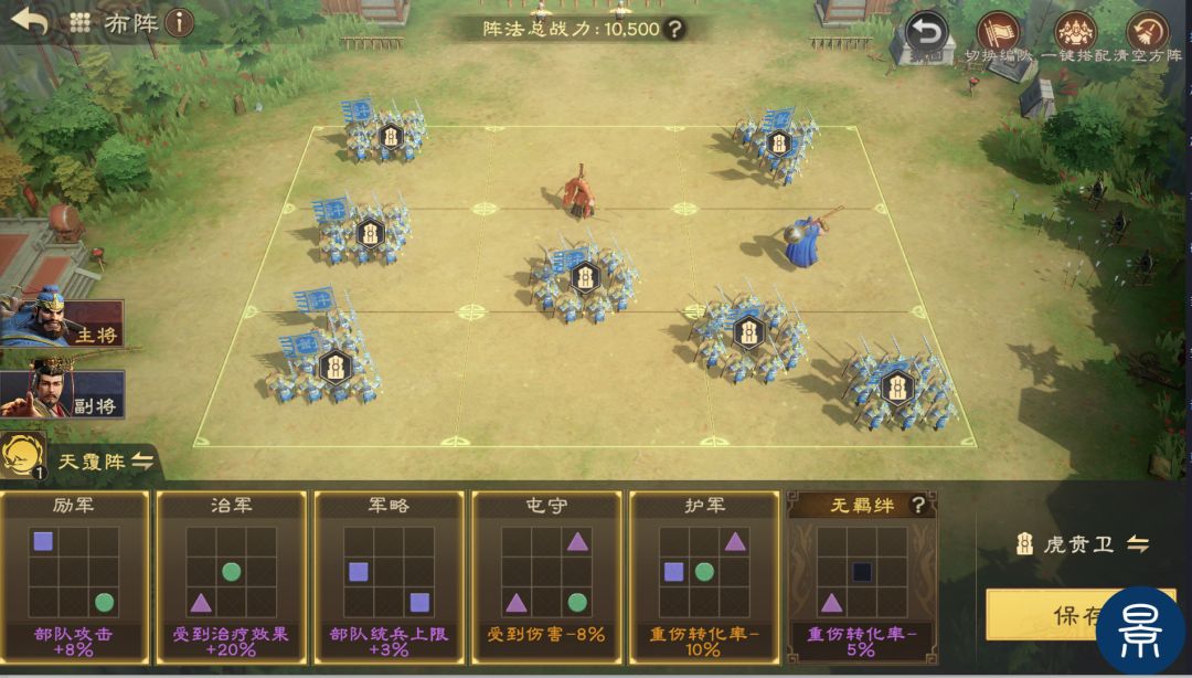 阵法首选天覆阵,释放技能后概率治疗自身部队,搭配许褚的被动效果,可更好的维持全队兵力稳定。天覆阵可将阵型全部站满,初期兵力不足,可优先选择屯守、军略、护军。