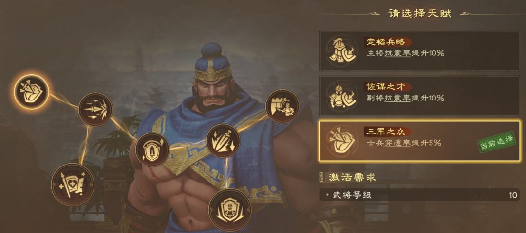 推荐路线:三军之众(提升穿透)→铁阵云平(提升盾兵攻击)→奇行之阵(携带生存阵法,提升恢复)/无畏之阵(携带生存阵法,提升伤害抗性)→实而备之/强而避之(分别针对普攻、技能流)→坚壁清野/运筹帷幄(分别针对普攻、技能流)→擐甲执锐(降低士兵受到伤害)→50级天赋(基于需求选择)