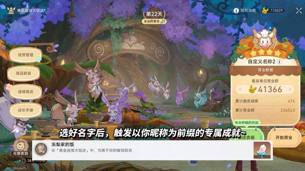 ※你问我为啥知道?因为冻梨我就是“自定义名称2”餐馆的店长呀……此时还会触发以你角色昵称为前缀的特殊成就【XX家的饭】,例如冻梨的就是【冻梨家的饭】。