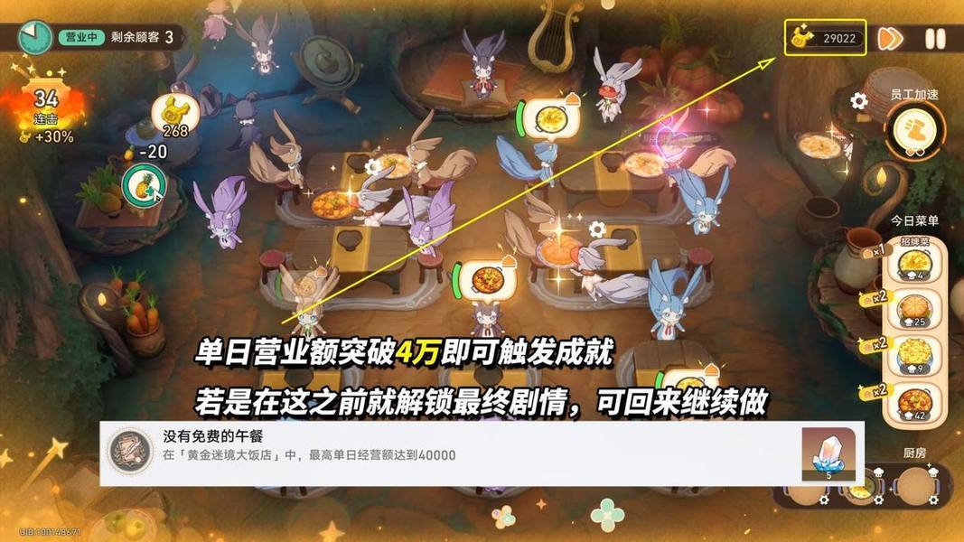 单日最高经营额度达到40000将会触发成就【没有免费的午餐】,但游戏主线进度对此并无要求,触达第四阶段12万总额则会触发一长段的后续剧情。如果你在此之前经常漏餐或者食材总缺,容易未触发就进入最终剧情了。