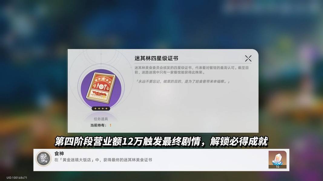 这是正常流程必定触发的成就,当第四阶段经营目标达成12万,触发晋升剧情,获得迷其林四星级证书,触发成就【食神】。