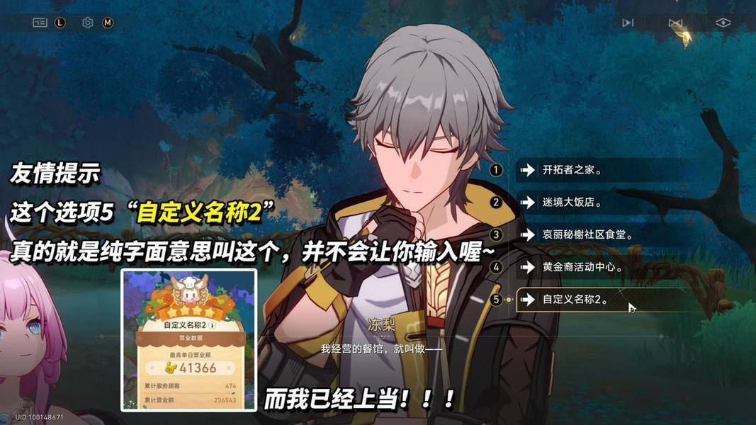 在初期教学进度基本完成的时刻,剧情走向会让你给餐馆取个名字,一共5个选项。其中最后一项名为“自定义名称2”,请不要抱有幻想,这个纯字面意思,并非输入框。确定好选项,后续整个剧情都会以此名称展开,请慎重喔!