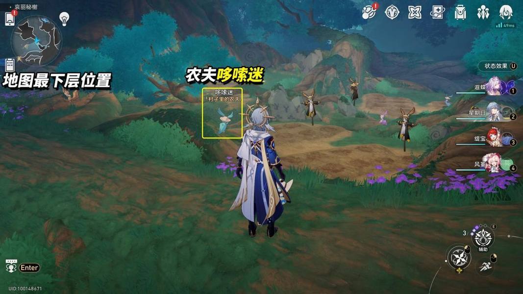 顺着树枝继续往上走可以看到一个发光的树洞,进入可直接滑到下层区,不远处就是放置了许多开拓者稻草人的菜地,与那只绿色的农夫“哆嗦迷”对话。