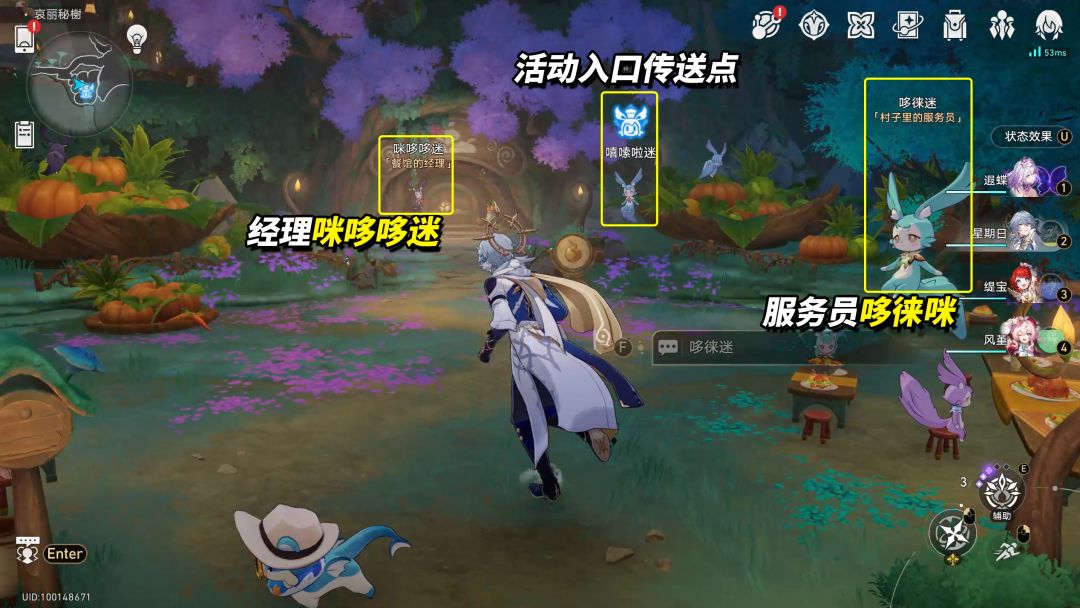 分布位置如下:活动入口即餐厅位置,可看到绿色的服务员“哆徕咪”与黑色的经理“咪哆哆迷”;
