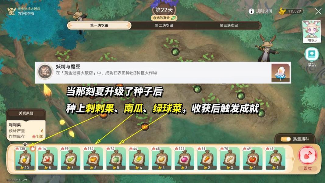 当那刻夏作为轮值负责人时(游戏正常进度无需主动切换),他会对南瓜、刺刺果(像菠萝)、绿球菜的种子升级,种植可产出巨大作物,第二日收获即可触发成就【妖精与魔豆】。