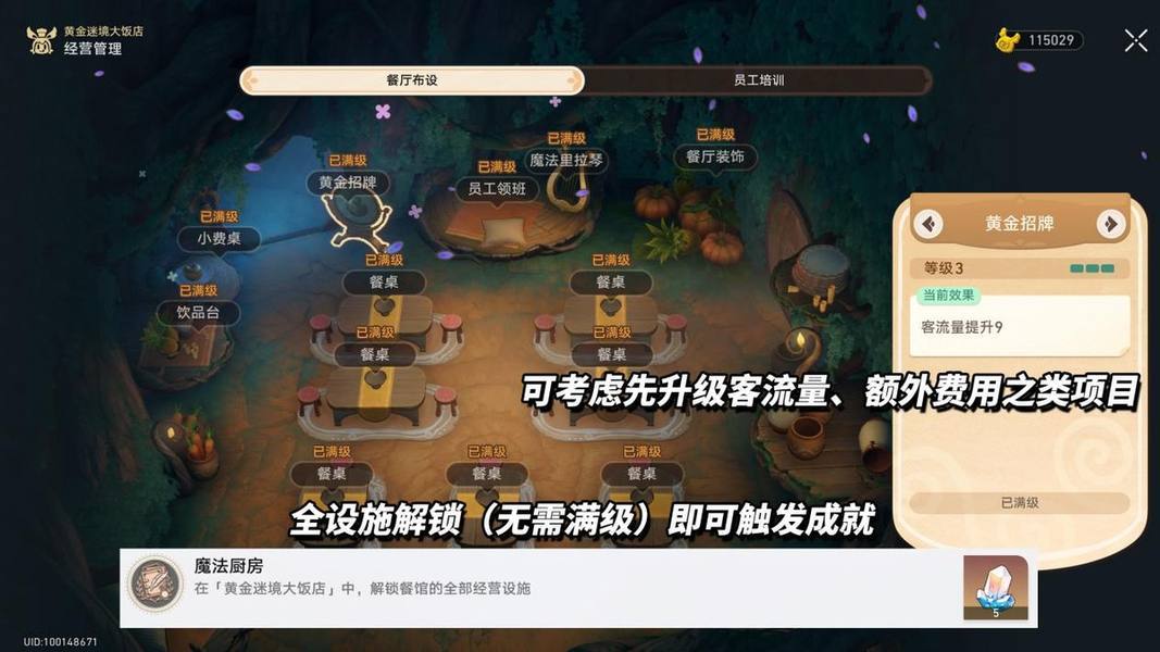 当你解锁全部经营设施时可触发成就【魔法厨房】,仅解锁非满级,进度中期差不多就可以触发了。