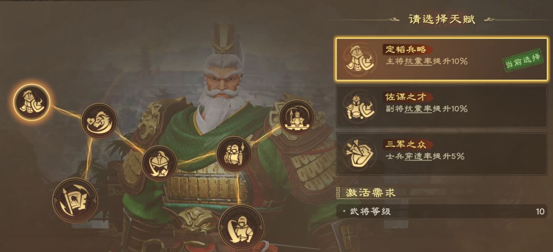 推荐路线:定韬兵略(抗震率)→万骑龙骧(骑兵提升生命值)→掌谋之阵(携带技能阵法,提升伤害)→焚舟破釜(提升技能伤害)→实而避之(提升普攻伤害抗性)/坚壁清野(提升普攻暴击抗性)→谋率深远(提升主动技能暴击伤害)/出其不意(降低怒气消耗)→50级天赋(基于需求选择)