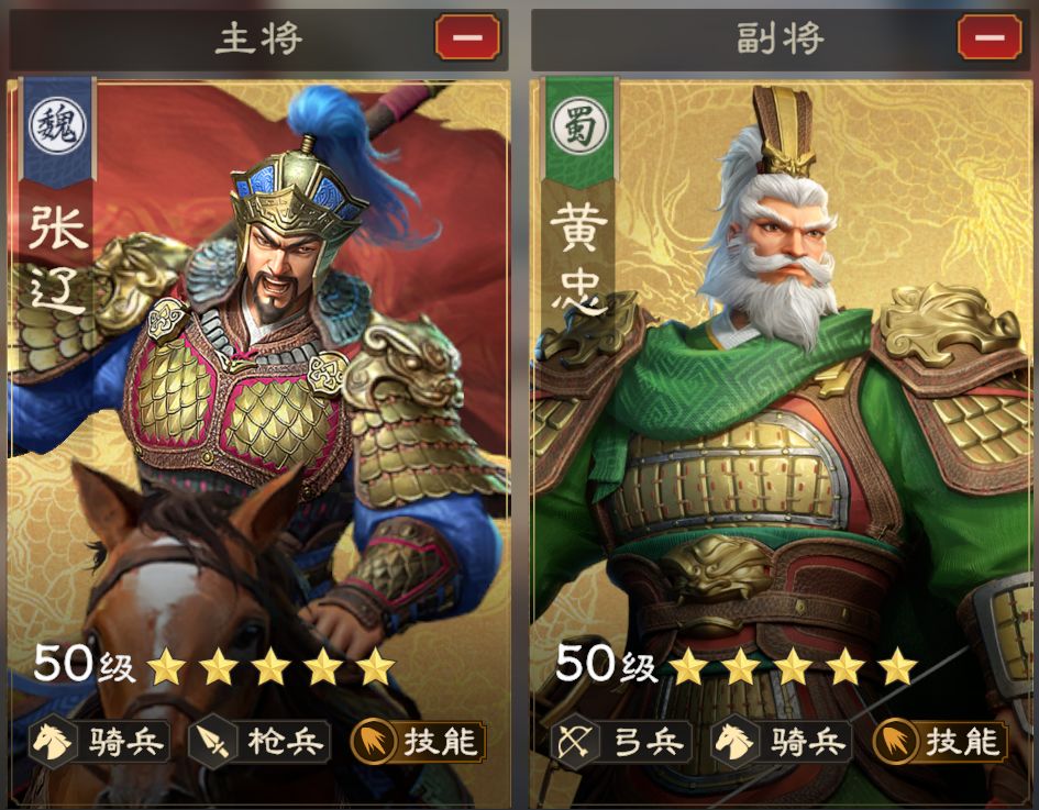 张辽搭配黄忠,技能释放频率会比搭配赵云更高,更高的技能频次可更快的压低敌方兵力。在实际配置的情况下,大家可基于武将练度灵活选择,黄忠一定是“老当益壮”有较高等级才能用。