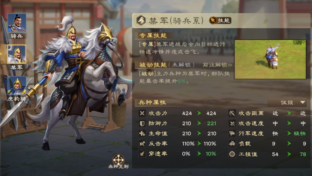 禁军在交战后可快速冲锋、击飞目标,可以更快的近身打伤害。骑兵除了可针对盾兵外,由于其冲锋、机动性优势,也能用来针对生存能力不足的弓兵阵容。禁军可额外提高暴击率,组建技能体系可以进一步提升技能伤害上限。