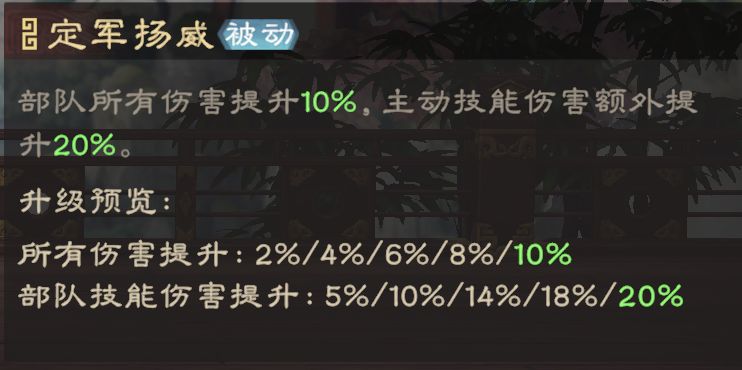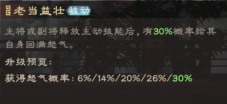黄忠可通过定军扬威提高部队所有伤害、主动技能伤害,适配主动技能伤害较高的武将(武力成长、系数越高越好)。在己方武将释放主动技后概率给其自身回满怒气,相当于可以一次释放2次主动技,可快速削减目标兵力。白板技能概率仅有6%,升到3级以上才有足够的强度。