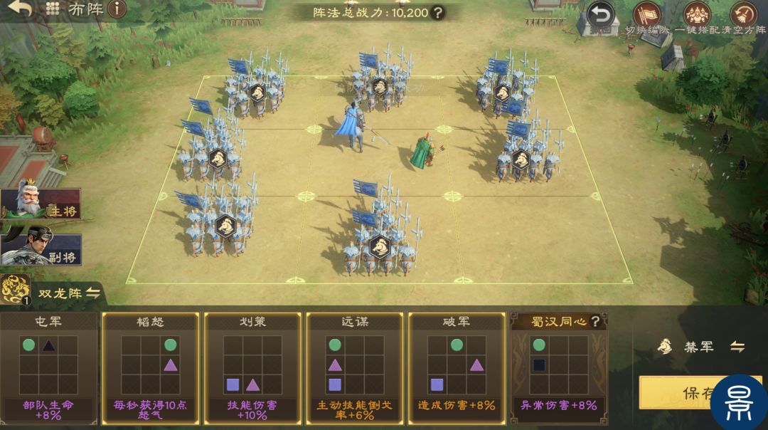 双龙阵可提升队伍暴击、暴击伤害,可大幅提高队伍整体伤害。在阵型方面,建议优先选择韬怒、划策、远谋、破军,提供回怒、造成伤害增加,均可稳定提高输出。