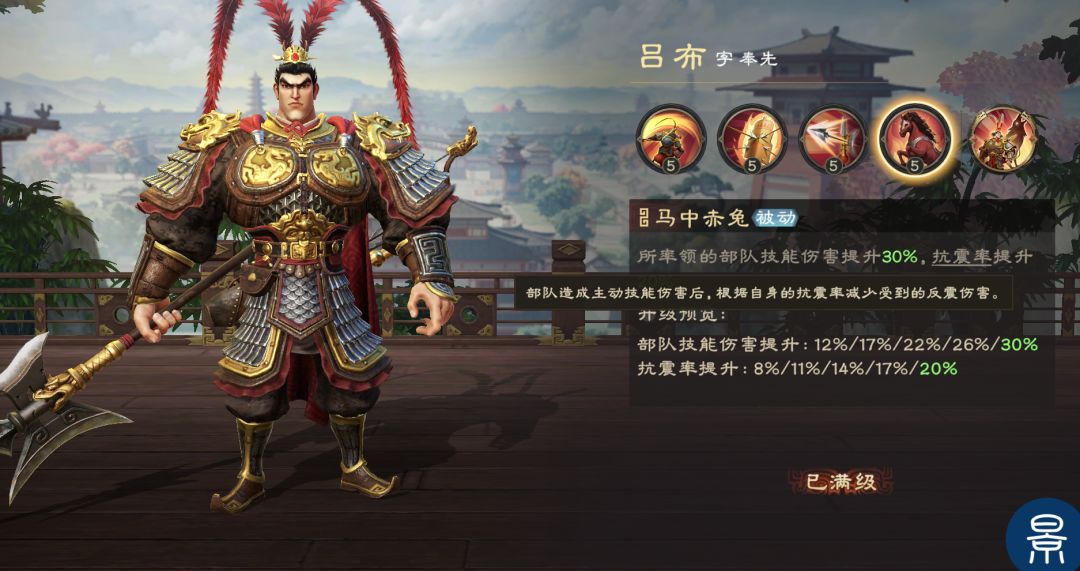如果想进一步提升输出,也可选择“吕布+黄忠”的配置,吕布有武力数值支撑再加上高额技能系数,也可以有相当高的爆发,而且吕布可提升“抗震率”,降低反震伤害,能够更好的维持部队兵力健康。