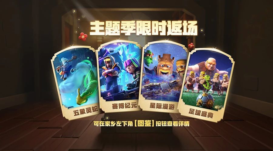 「五象灵蛇」、「赛博纪元」、「星际漫游」、「足球盛典」主题季限时返场来啦!首领们还想返场什么主题场景,欢迎留言告诉阿蛮