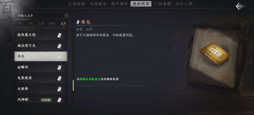 点击屏幕左下角,打开“江湖指引”,输入武学的名称,江湖懂王百晓生就会为你指点获取方法。