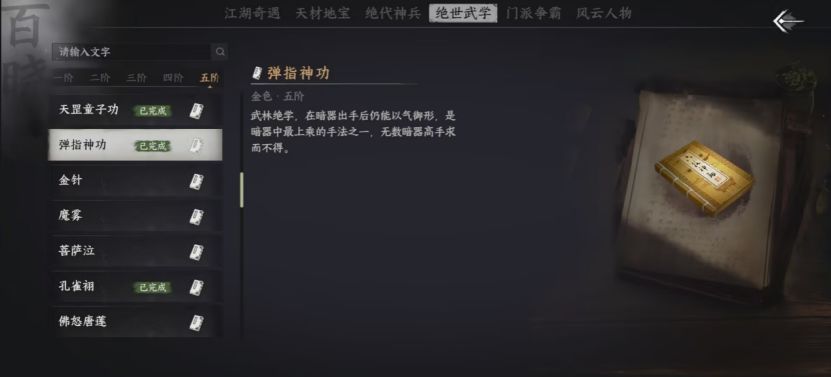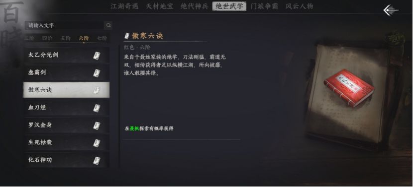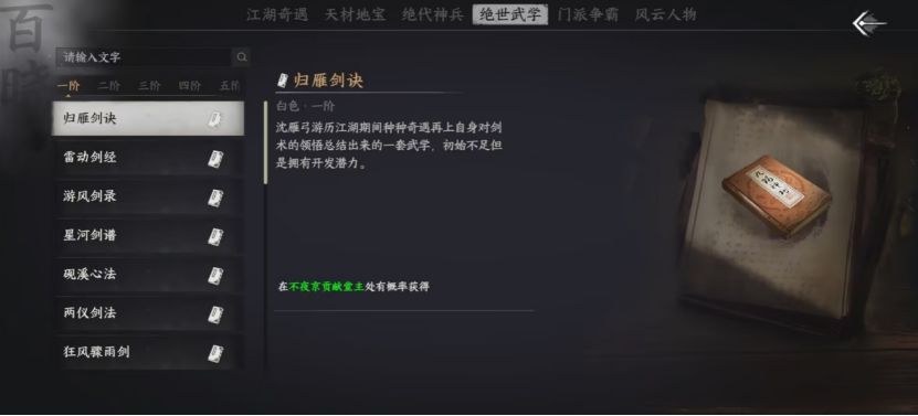 打开“江湖游记”页面内“绝世武学”一栏,可按阶层查看各类武学介绍。