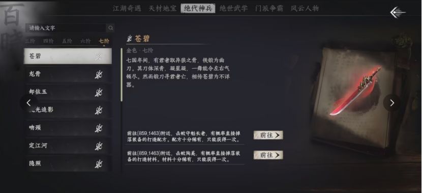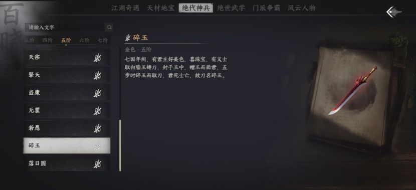 打开“江湖游记”页面内“绝代神兵”一栏,可按阶层查看各类神兵的介绍。