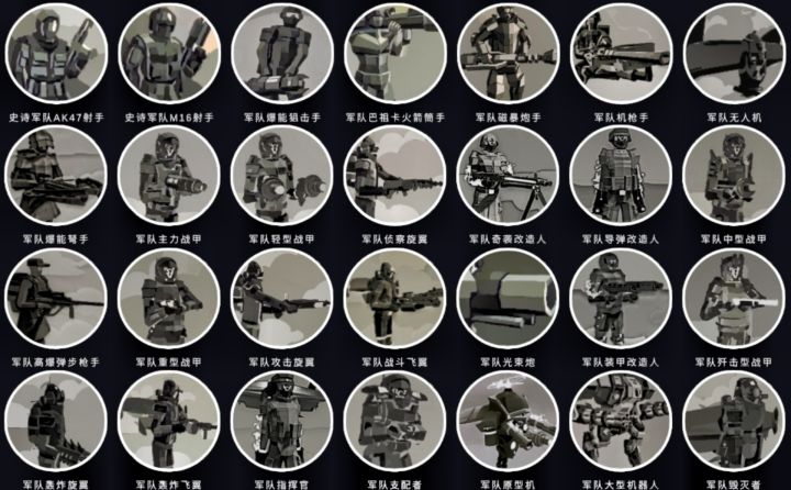 兵种分为六大类型:步兵(图4)、战甲(图5)、飞行(图6)、重火力(图7)、特战(图8)和史诗(图9)。价格介于500至10000之间,使用该派系挑战官方战役是完全合适的!