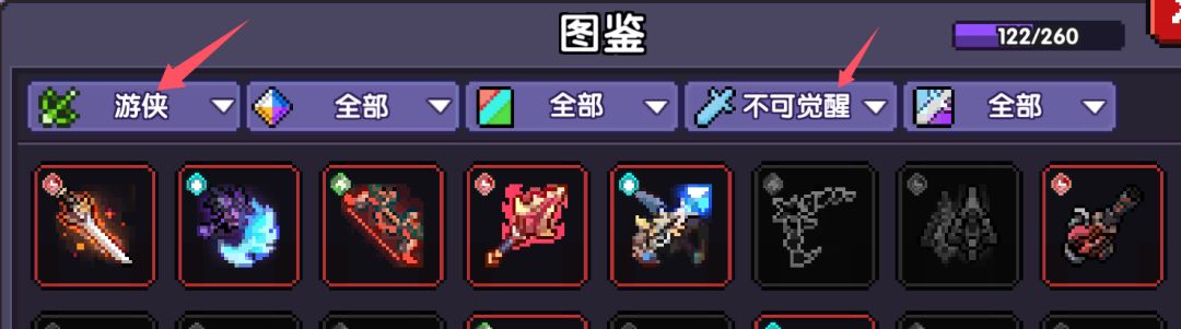 打开图鉴,第一个箭头指的地方选择自己的职业,第二个箭头指向选择不可觉醒。