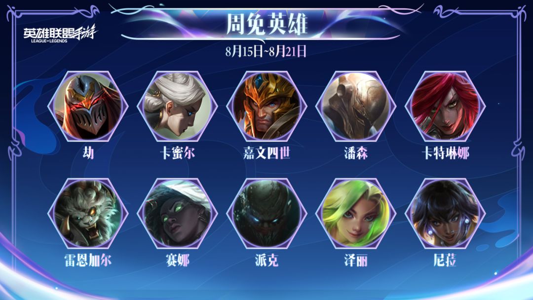 新一轮周免英雄将于8月15日(明日)开启!劫、卡特琳娜、泽丽等人气英雄名列其中,召唤师们快携手心仪的英雄在峡谷中大展身手吧~