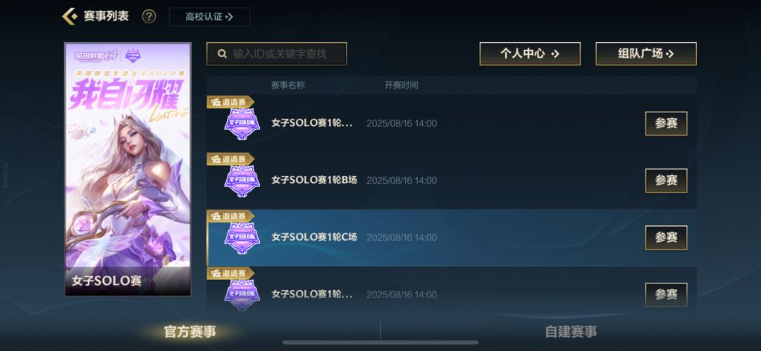 8月14日(今日)-8月15日(明日),端内报名正式开启,所有满足预报名资格的召唤师即刻登录游戏,前往主界面右上方【消息盒子】进入赛事大厅,在【官方赛】列表任选1场女子SOLO赛完成报名。