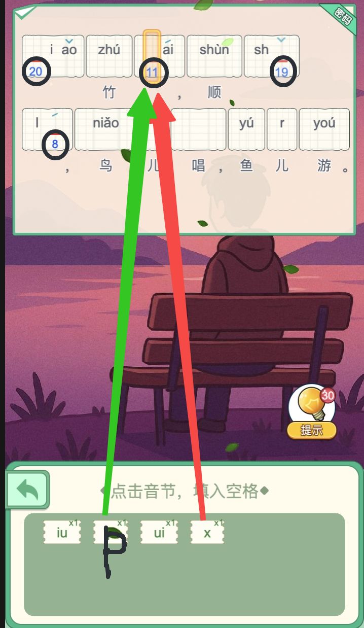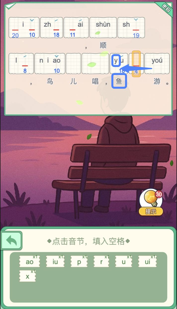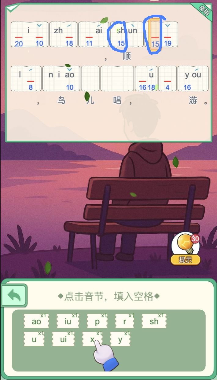这里有两个相邻的数字 15,前面一个已经有音节“sh”,表明第二个也是“sh”,在底部选择“sh”x1填入。同理,句子最后填入 y,获得提示词“鱼”。