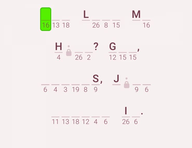 在我们设计主关卡的时候,也一直在思考,如何使用拼音里的音节来做更具推理过程的解谜体验。期间我们试玩来其他游戏,其中一个叫 Cryptogram 引起我们的注意。