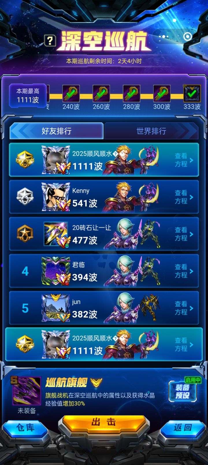 然后开始培养强袭斗士,勇士绝意,彻翼巡星,极速守卫,一件拉满,不要平均拉,顺序是勇士-守卫-巡星-斗士,中途要收集神锋,配合勇士,打深空巡航,有很多人说斗士垃圾,不要养斗士,我想说的是,用斗士拉战力,普通装备就是过渡神锋套用的,养斗士的路上不影响收集神锋套。