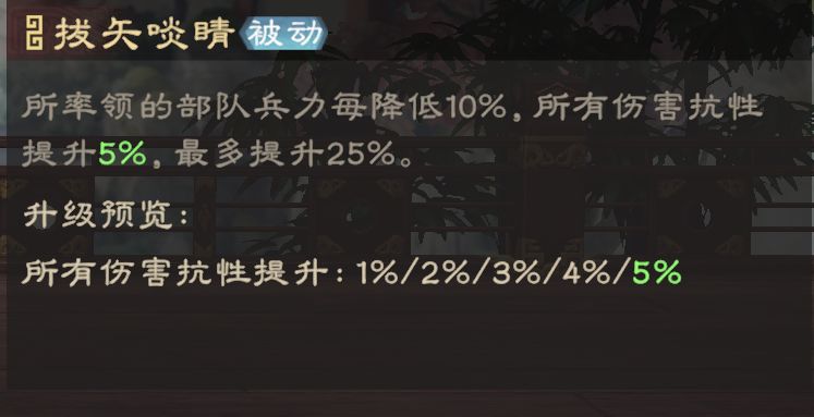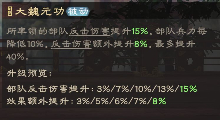 夏侯惇拥有较出色的武力、统御成长,被动可大幅提升自身抗性及反击伤害,在持续作战的情况下,可通过“反击”打出高额伤害。由于其承伤能力出色,大家在构建反击队伍时,可优先考虑这名武将。