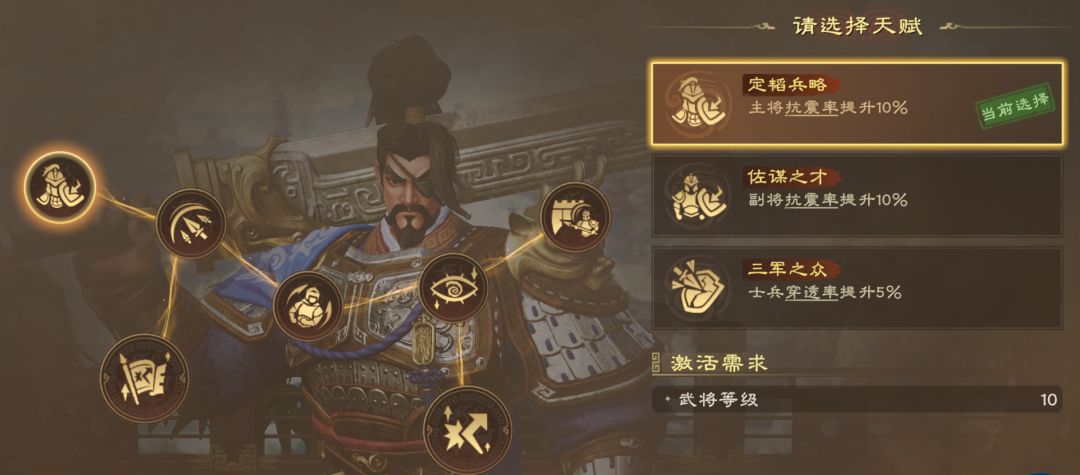 推荐路线:定韬兵略(提升抗震率)→戈矛山沓(枪兵提升防御)→反击之阵(携带反击阵法,提升反击流)→反败为胜(提高反击伤害)→坚壁清野(提升普攻暴击抗性)→谋定后动(提升反击率)→50级天赋(基于实际需求选择)