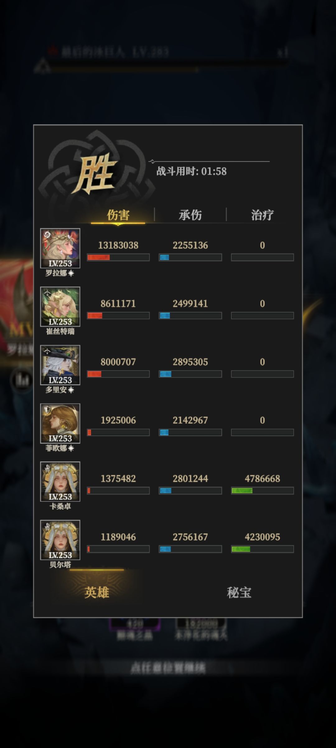 没什么好说的,挂机怪,站位阵容如下,由于boss3600w血,如果伤害不够那就单奶再上个输出位,什么娜娜冰法绿弓夜魅都行