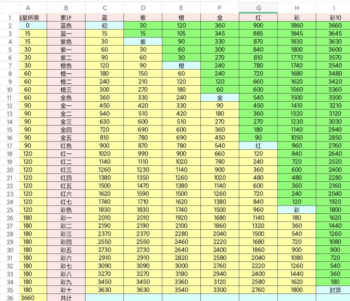 做了一个表格让大家兑换碎片时一目了然
