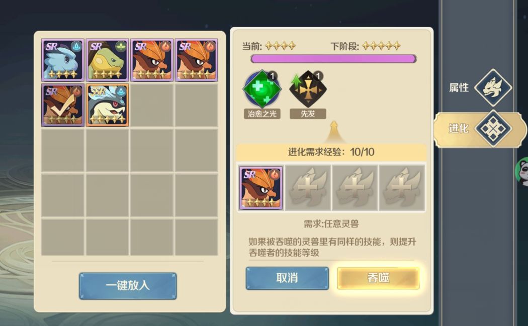 进化:通过吞噬任意灵兽获得进化经验。PS:注意了,这个时候不要吞噬灵兽本体。本体留在升星时候使用。 灵兽升星需要吞噬同系5星灵兽。(比如:水系吞水系)所以保留本体会比较方便。