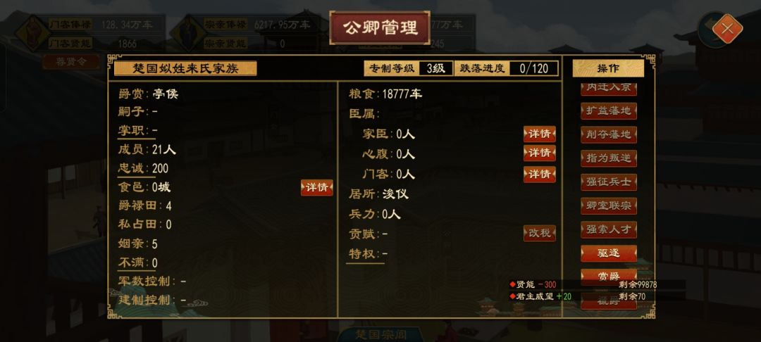 首先如果你有公卿的话可在公卿管理界面,进行赏爵,封其为乡侯。然后再进行褫夺爵位,就可以获得20君威,一次只消耗300贤能,来回也就是600贤能。只要贤能充足,就可以无限刷君威!