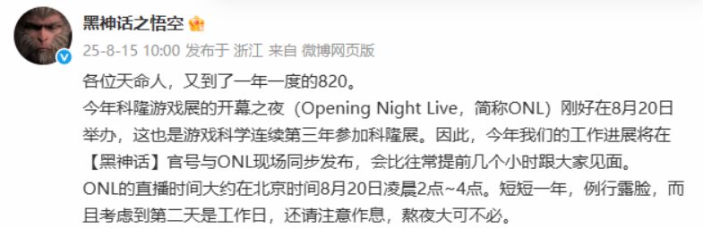 今日,游戏科学正式官宣,《黑神话:悟空》将于8月20日放出最新消息。官方称,今年科隆游戏展的开幕之夜(ONL)在8月20日举办,这也是游戏科学连续第三年参加科隆展,工作进展将在【黑神话】官号与 ONL 现场同步发布,会比往常提前几小时与玩家见面 。
