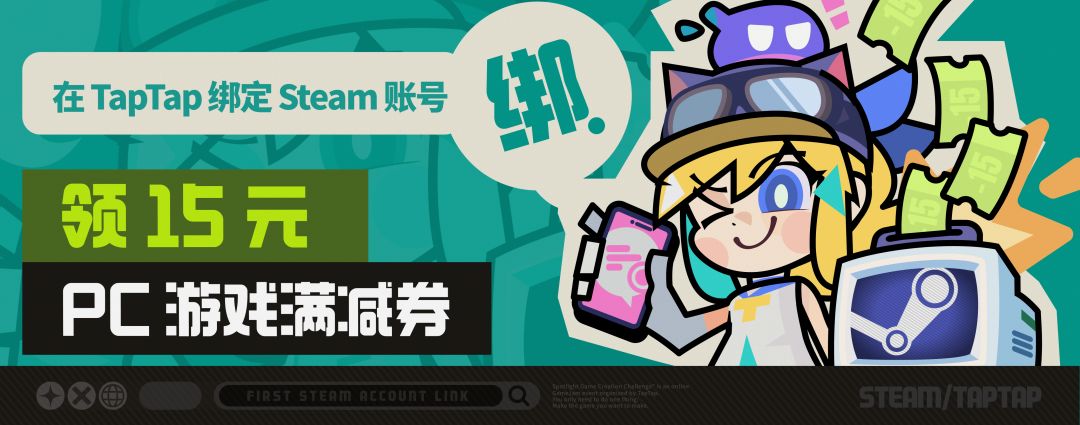 在 TapTap 绑定 Steam 账号领取 15 元 PC 游戏抵扣券(满 50 立减,可叠加史低),还有小站同款头像框一枚
