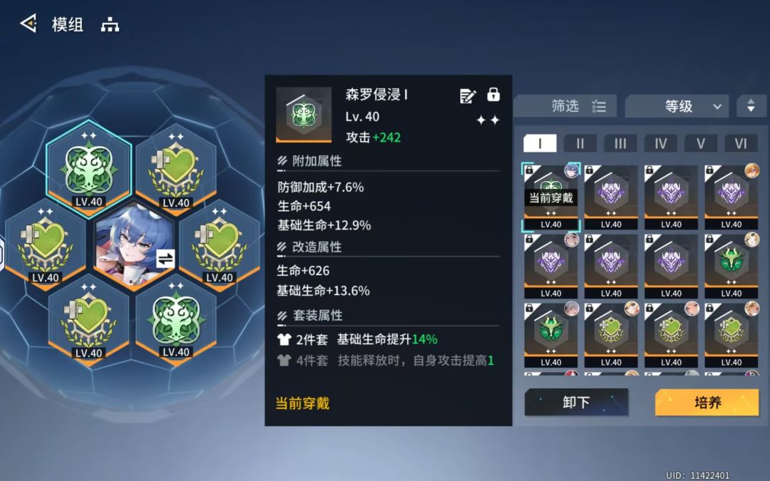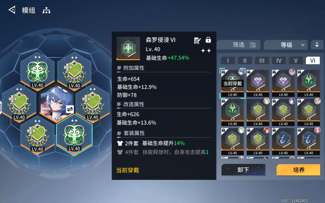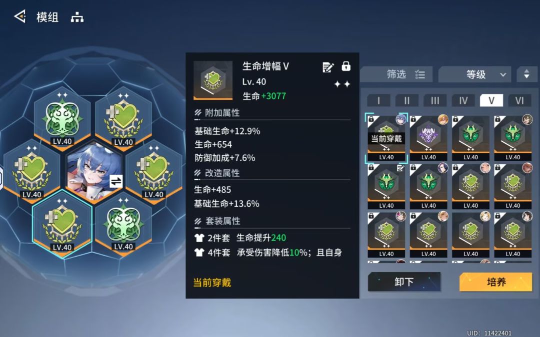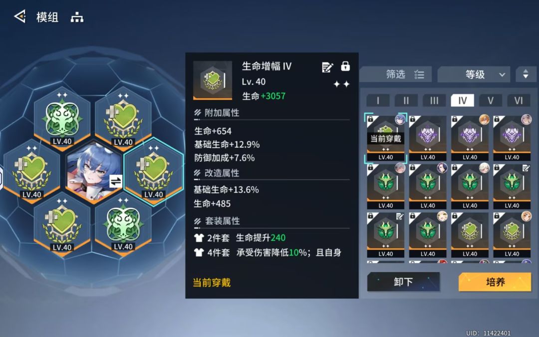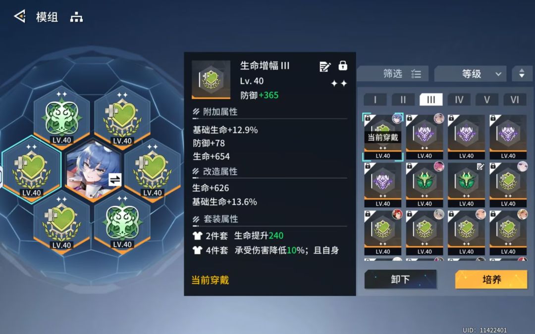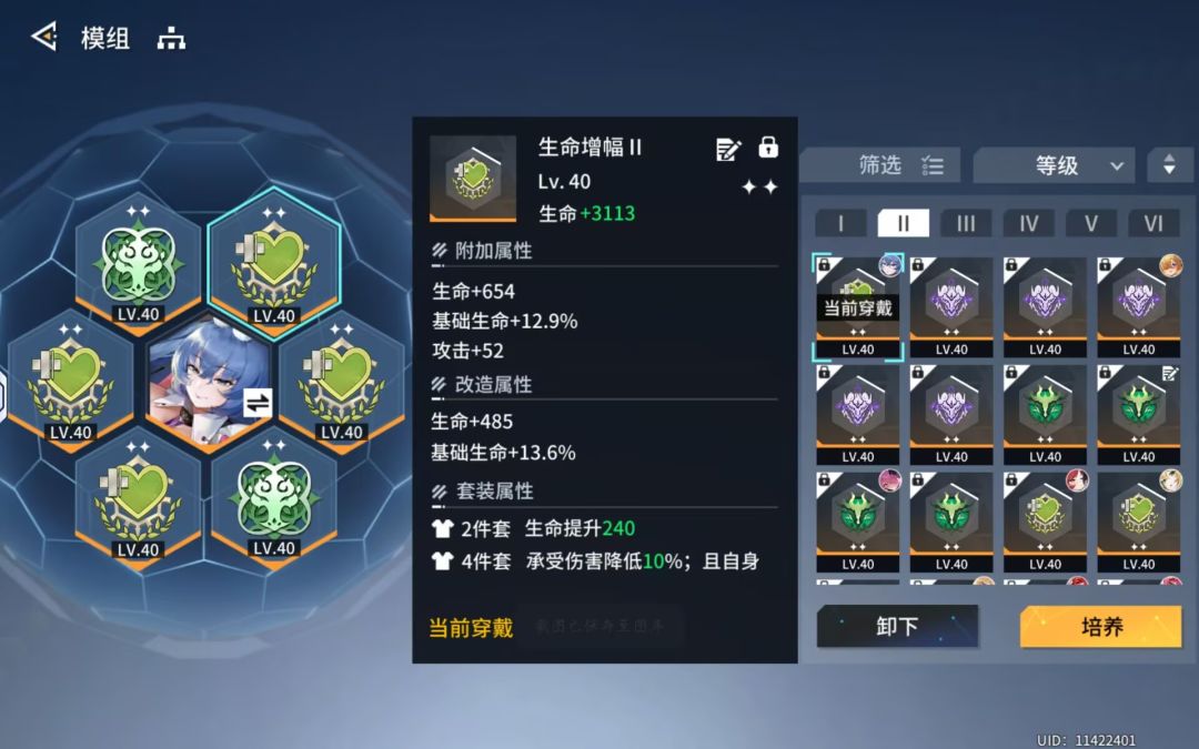 一般让辉月速度高于己方C位,模组大多选用四生命两森罗,四生命0.9独立乘区减伤,两森罗10%生命加成。456主词条生命/速度、生命、基础生命,副词条基础生命+生命+其他。