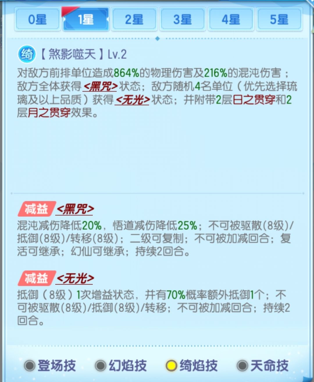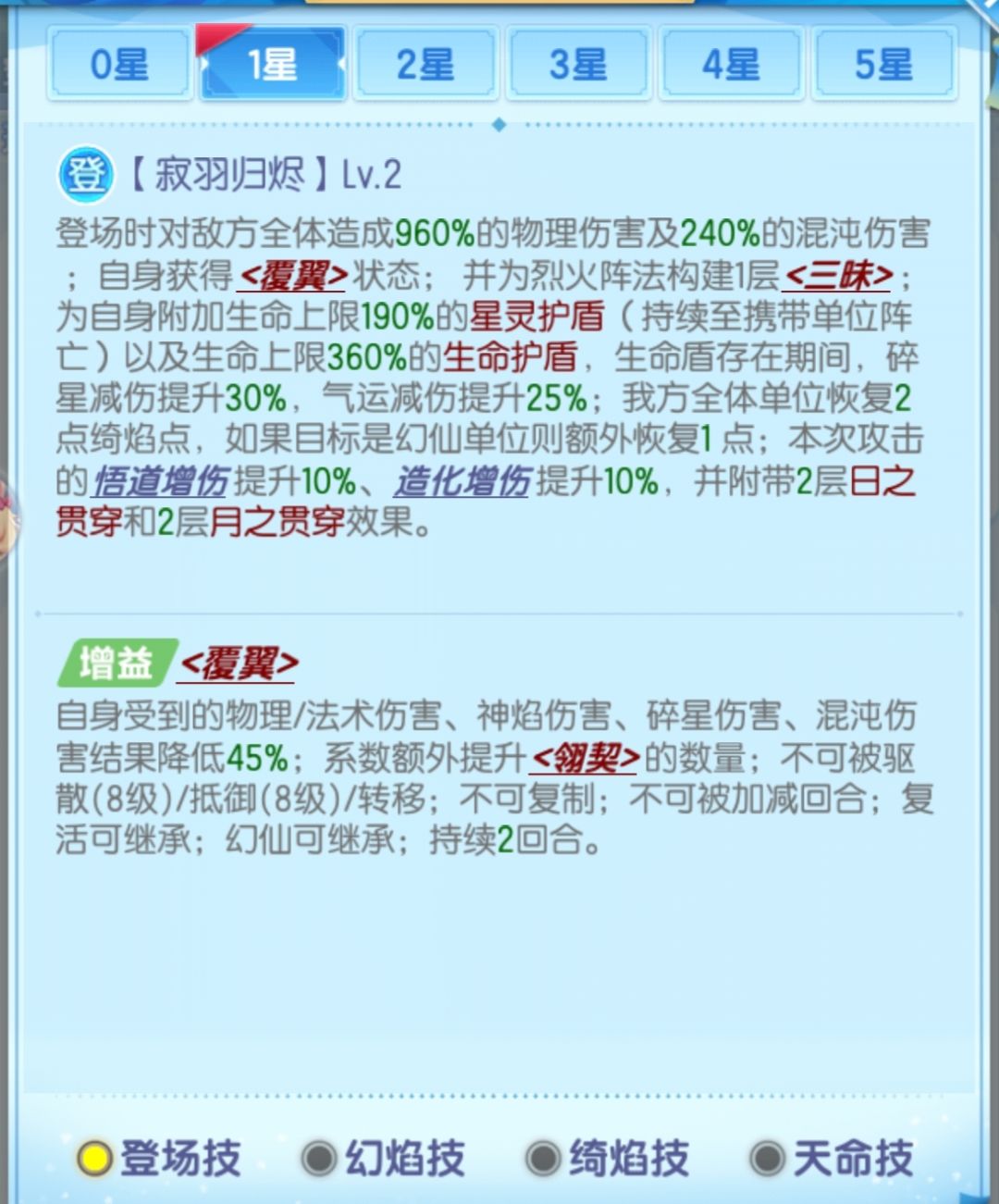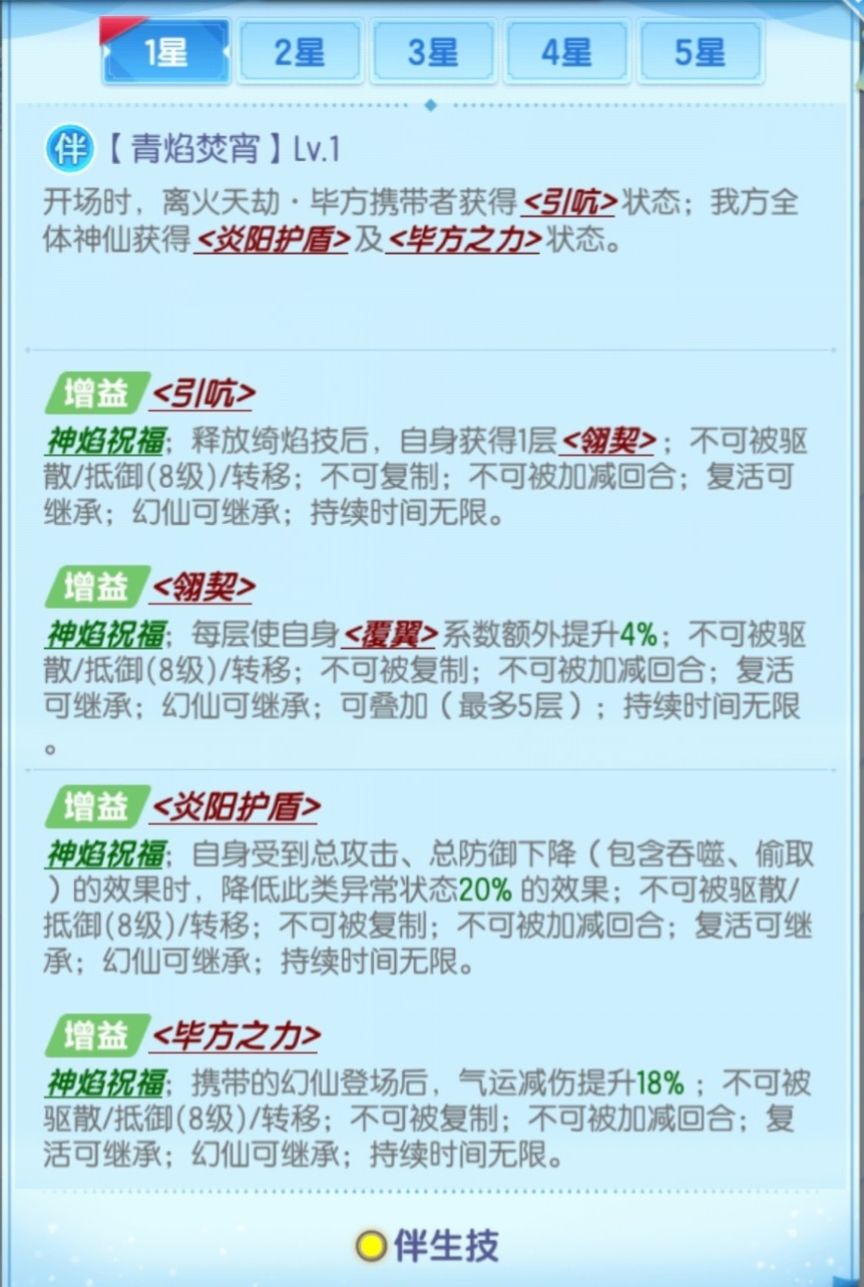 (2)、“翎契”按满效果5层算,1/3/5星毕方登场时能获得65%/75%/85%受到的伤害结果降低效果。