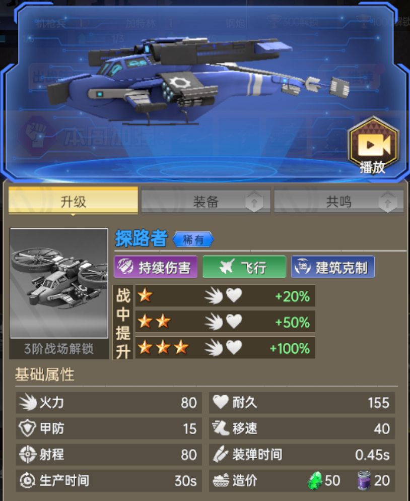 此外,由于该品质战机独有的“建筑克制”属性,探路者战机能够对敌方基地造成高强度的火力压制。同时,低廉的造价又使探路者可以轻松升级,哪怕在游戏中后期也能派上用场!