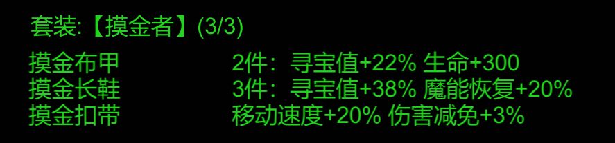 另外,【摸金者】套装的3件套属性,在增加38%寻宝值的同时,还可以增加20%的魔能恢复,是在野外或秘境打怪的不错选择。