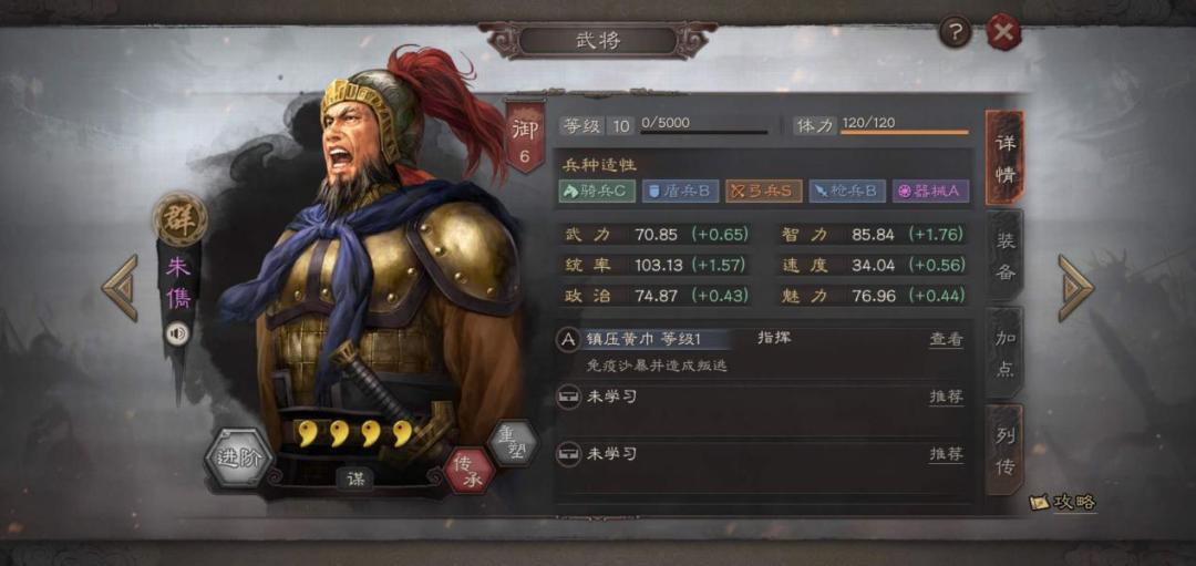 镇压黄巾(A级):战斗第二回合开始,使我军全体免疫沙暴状态,并且使敌军全体陷入叛逃状态,每回合持续造成伤害率(1级)44%-(满级)88%,受武力或者智力最高一项影响,无视防御,持续2回合,若目标为黄巾军,伤害率提高20%。决定朱儁能成为“无冕之将”的关键就在于第二回合开始,对全体无视防御的88%的伤害,同时镇压黄巾还是指挥战法,只有S3事件战法当锋摧决和虚弱效果可以克制,朱儁主战法的发挥是非常稳定的,每场战斗大约伤害4000~6000这个数值之间。