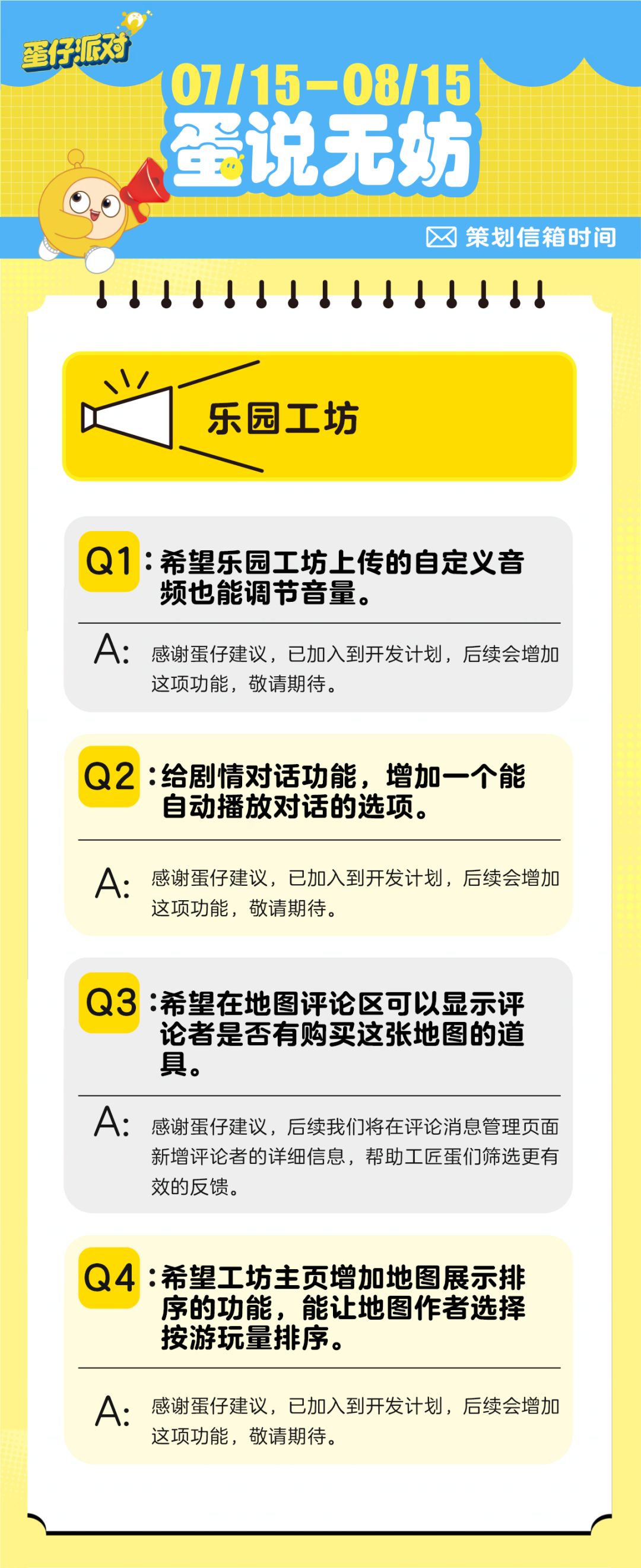 每月15日,皮蛋都会认真收集蛋仔们的意见并带回策划的回信!