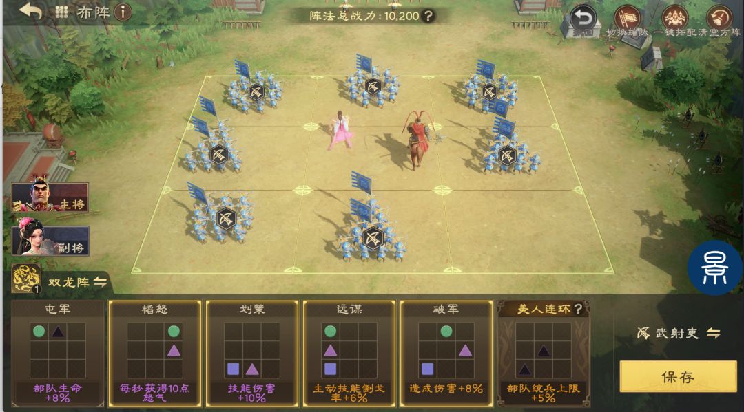 双龙阵可提高部队暴击率及技能伤害,可进一步提高队伍爆发。技能系阵容可以在初期快速压低敌方兵力,从而取得额外战损收益,阵型可以优先选择韬怒、划策、远谋、破军。