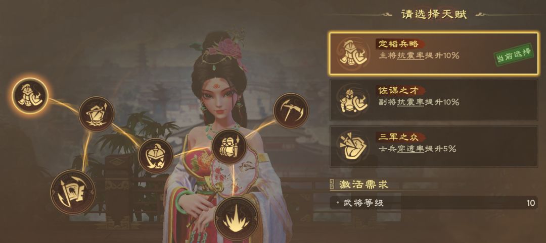 推荐路线:定韬兵略(抗震率)→双带两腱(弓兵提升攻击)→掌谋之阵(携带技能阵法,提升伤害)→焚舟破釜(提升技能伤害)→实而备之(提升普攻伤害抗性)/镇定自若(处于控制时降低受到的所有伤害)→谋率深远(所有武将造成暴击伤害提升)→50级天赋(基于需求选择)