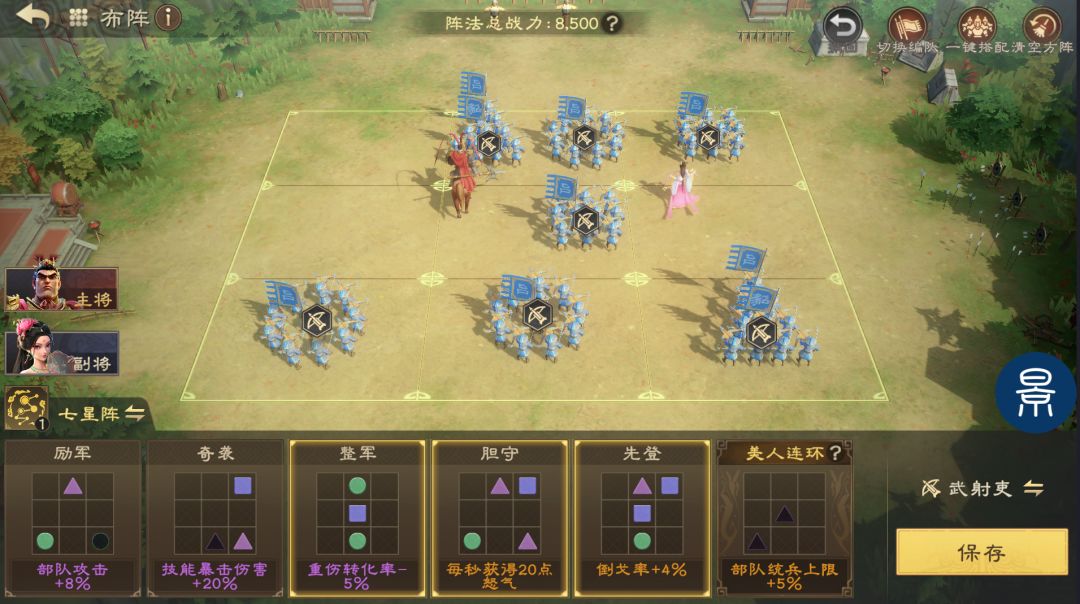 七星阵在部队普攻后概率提升主动技伤害,并且可通过“胆守”额外获得怒气,提高主动技释放频率,阵型可以优先选择胆守、奇袭、先登。如果与吕布搭配,能够激活美人连环,阵型选择美人连环、奇袭、胆守。