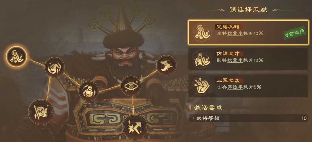 推荐路线:定韬兵略(提升主将抗震率)→百骑虎跃/千骑风靡(骑兵提升攻击/生命)→反击之阵(携带反击阵法,提升反击伤害)/奇诡之阵(携带控制阵法,提高武将伤害)→反败为胜(提高反击伤害)→明察先知(提升异常伤害抗性)→谋定后动(提升反击率)/蓄势待发(延长控制)→50级天赋(基于实际需求选择)