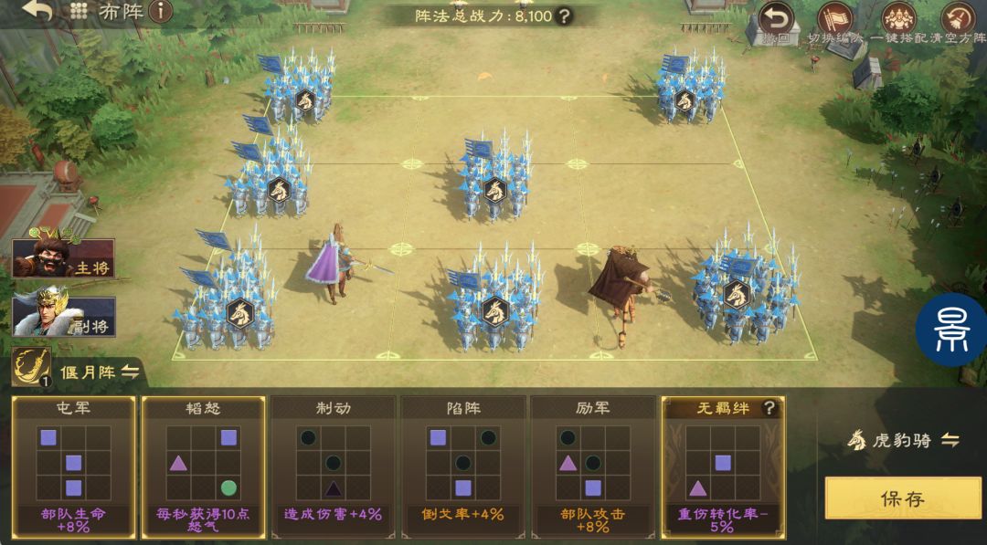 如果走控制路线,可选偃月阵、方圆阵,两个阵法取决于环境中主动、普攻流队伍哪个更多一些,可提升控制覆盖效果。偃月阵型可选择屯军、韬怒、无羁绊;方圆阵选择铁阵、强袭。