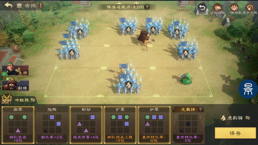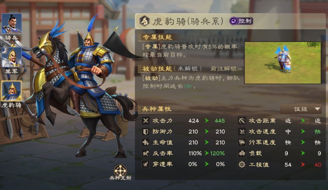兵种要基于队伍体系进行选择,控制路线可用虎豹骑,普攻概率眩晕,并且能延长控制时间,例如“马超+孟获+虎豹骑”就能多频触发控制,大幅降低敌方部队输出;
