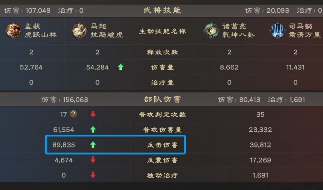 走控制体系时别觉得“反击伤害”多余,除了主动技伤害外,反击伤害也会有较高比例的输出。孟获的优势主要在持续作战中体现,可以一边打控制降低战损,一边输出。