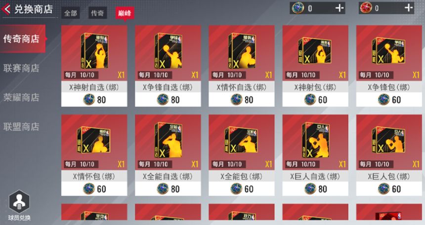 心仪的黑卡获取离不开巅峰积分的兑换,我们点击主界面右侧的兑换商店,在传奇商店即可看到用巅峰积分可兑换的X品质球员包。
